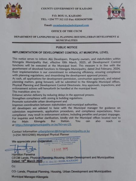 March 20, 2025 In Kitengela Municipality News‚ Uncategorized 0 IMPLEMENTATION OF DEVELOPMENT CONTROL AT MUNICIPAL LEVEL
