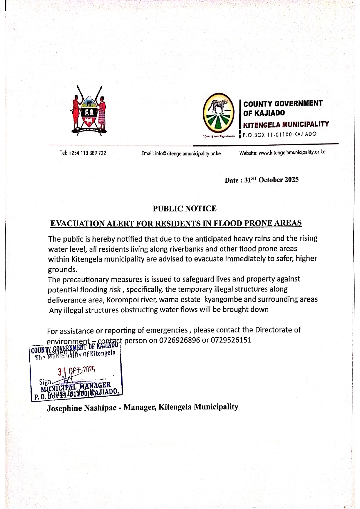 The public is hereby notified that due to the anticipated heavy rains and the rising water level, all residents living along riverbanks and other flood prone areas within Kitengela municipality are advised to evacuate immediately to safer, higher grounds.